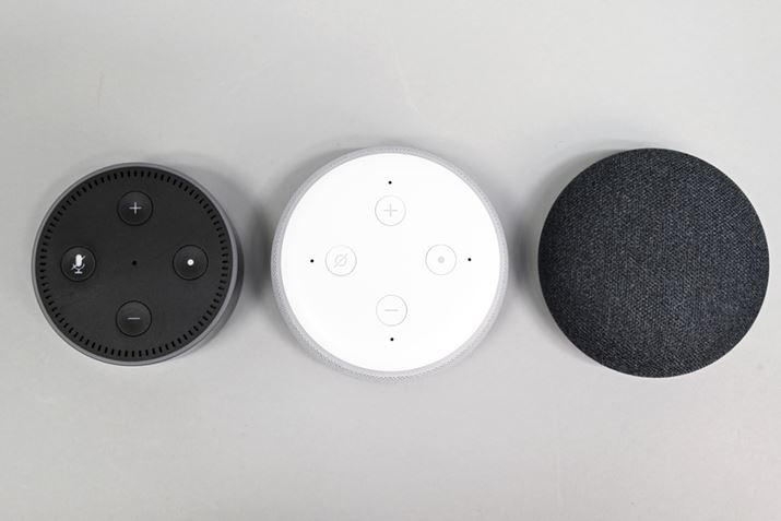 第2世代「Echo Dot」(写真左)、第3世代「Echo Dot」(写真中央)、「Google Home mini」(写真右)で大きさを比較したところ