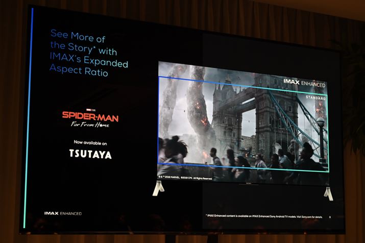 「TSUTAYA TV」で配信される作品は、『スパイダーマン:ファー・フロム・ホーム』をはじめ、『スパイダーマン:ホームカミング』『ジュマンジ/ウェルカム・トゥ・ジャングル』など、ソニー・ピクチャーズ エンタテインメントの作品を予定。いずれも作品も料金は都度課金で770円(税込)となっている。一部のIMAX Enhanced対応コンテンツは、独自のアスペクト比を採用したのも特徴となっており、『スパイダーマン:ファー・フロム・ホーム』にはIMAX独自の画角で特別に制作された40分のシーンが含まれている。IMAX Enhanced認証を取得した有機ELテレビ「BRAVIA A9G」「A9F」や、液晶テレビ「BRAVIA Z9F」「X9500G」と組み合わせることで、IMAX Enhancedのフルスケール映像で楽しめるようになる。