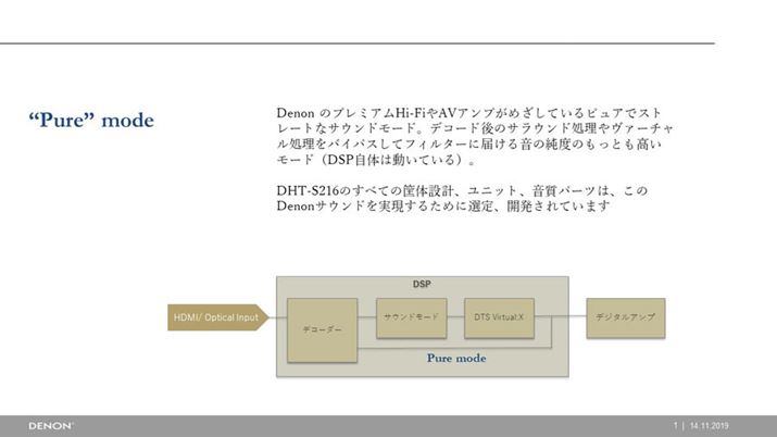 特徴的なのは、上述のMovie/Musicといった基本のサウンドモードとは別に、「Pureモード」という音質設定機能を搭載すること。これは、簡単に言うと内部のDSPによるサラウンド処理やバーチャル処理をバイパスする機能となる。音声信号をデコード後、クラスDアンプにダイレクト伝送することで音の純度を高める。デノンが、これまでHi-FiコンポーネントやAVアンプで目指してきた志向性と同じものを、サウンドバーでも追及したというわけだ。
