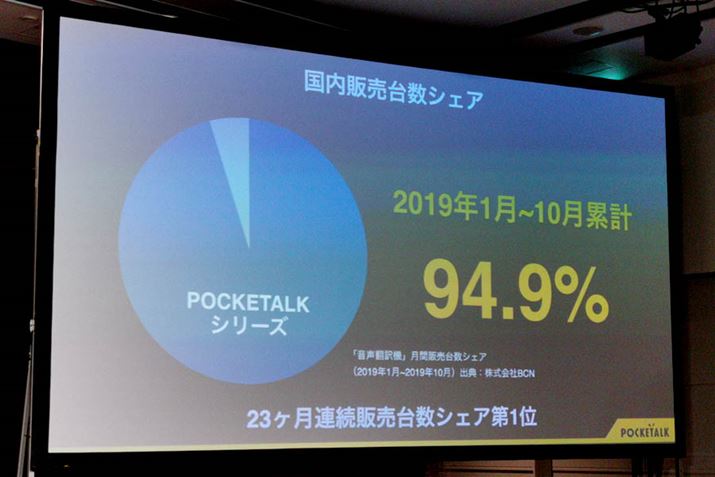 近年のインバウンド需要の拡大や、来年に迫った東京オリンピックの影響もあってか、「ポケトーク」シリーズの累計出荷台数は50万台を突破(2019年11月時点)。同シリーズの国内での「音声翻訳機」販売台数のシェアは94.9%(メーカー調べ)と、今、圧倒的に売れている音声翻訳機だ。