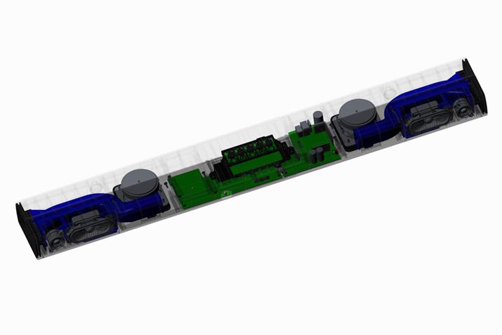 内部に25mmツイーター、45×90mm楕円形ミッドレンジ、75mmサブウーハーを2基ずつ搭載する3ウェイ・6スピーカー設計の2.1ch構成