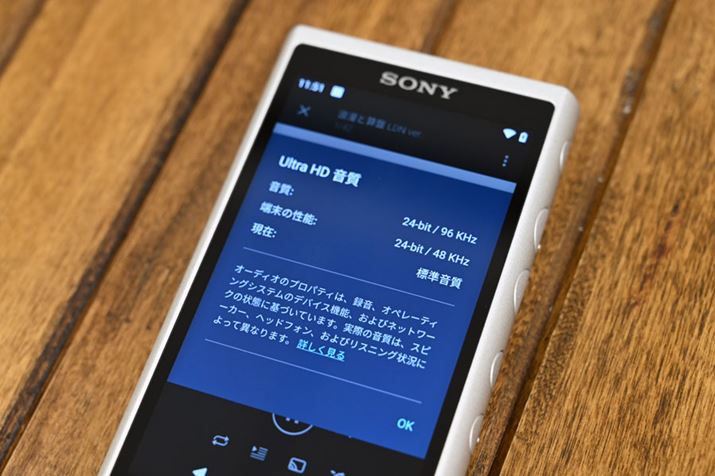 なお、Android OSは8.0以降「AAudio」という新しいオーディオAPIが採用されたため、こちらを利用していない古いアプリだと16bit再生になってしまう、という状況が発生している模様。現在、「Amazon Music(HD)」アプリがその代表例となっている。しかしこれは、Android OS採用スマートフォンにもいえることで、ウォークマンに限った話ではなく、アプリ側で早期に対応して欲しいところではある。とはいえ、ウォークマン用音楽再生アプリ「W.ミュージック」では、Androidの音楽回路をバイパスしてアナログ出力するため、11.2MHzのDSDをネイティブ再生できるようになっている。こちらを部分的に活用すればイケルのでは、とソフト開発者の苦労を知らない人間はついつい考えてしまうが、そのあたりは今後の動向を見守りたいところだ。