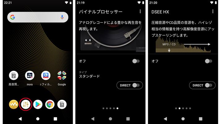 「バイナルプロセッサー」や「DSEE HX」といったソニー独自の高音質化機能は、プリインストールされている「音楽設定アプリ」経由で操作する形になっている