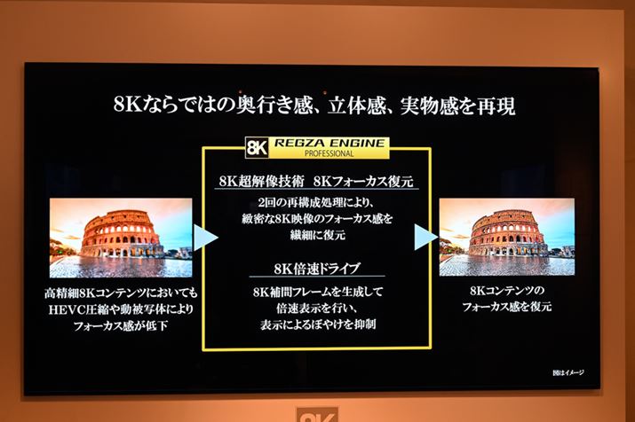 高精細な8KコンテンツにおいてもHEVC圧縮や動被写体によりフォーカス感が低下するため、8Kレグザエンジンでは「8K超解像技術 8Kフォーカス復元」と「8K倍速ドライブ」という2つの新技術を導入。再構成処理を2回にわけて実施し、緻密な8K映像のフォーカス感を復元する「8K超解像技術 8Kフォーカス復元」と、8K補完フレームを生成して倍速表示を行うことで、表示によるぼやけを抑制する「8K倍速ドライブ」により、8Kならではの奥行き感、立体感、実物感の再現を実現したそうだ。