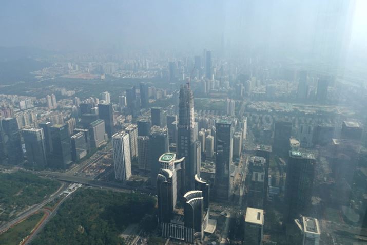 近代的な高層ビルが立ち並ぶ深センの風景。世界第4位の高さを誇る平安国際金融中心ビル展望フロア―(地上高541m)より撮影