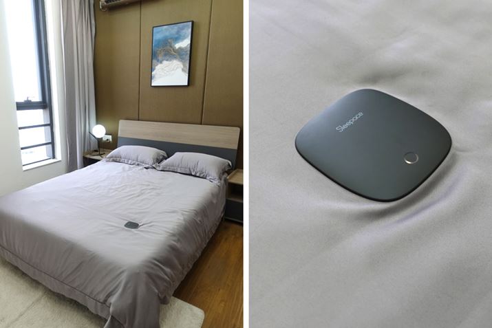 次に、リビングからベッドルームに移動すると、かけ布団の上に何やらセンサーらしきモノが。いわゆる睡眠の状態を計測するもので、もちろん収集したデータはスマートホームの一環として一括管理される。