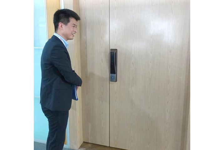 スケールの大きさに圧倒されつつ、今回の目的であるデモルームへ。どうやら、扉からデモがスタートするらしい。ドアロックがTCLの製品で、指紋認証機能でスマートに解錠する。ジェイソンさん、ここで「つかみはOK」という笑顔(ドアノブだけに)。