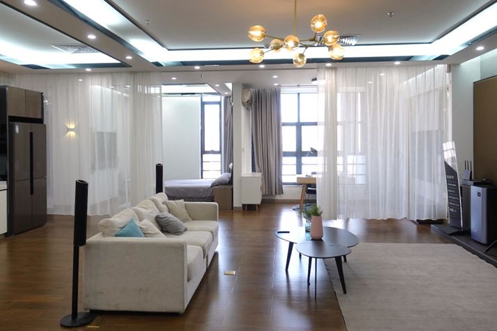 デモルーム内全景。室内はさながらタワーマンションの一室といった仕立て。TCL製品によるスマートホームを実際の住環境に近い雰囲気で体験できる。