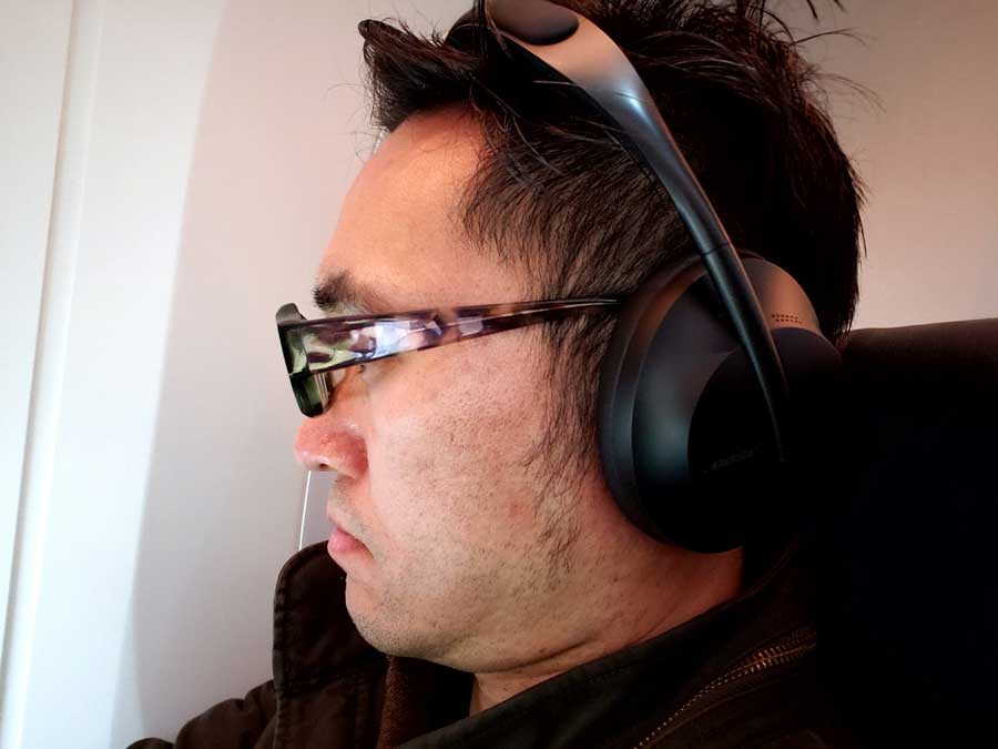 飛行機内の騒音に対するノイズキャンセリング効果はすばらしく、重低音の騒音は1/6以下程度だろうか。中域も騒音を遠くから低めの帯域でわずかに聴こえる程度に抑えてくれる。高域のノイズはあまり気にならない。ただ、周囲の環境に応じてノイズキャンセリングの効果を切り替えている弊害か、飛行機内では時折風が強く吹き付けるようなノイズが入り、装着感や設定をいろいろ試しても解決できなかった。
