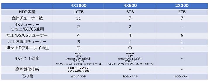 今回発表された「DMR-4X1000」「DMR-4X600」「DMR-2X200」の仕様比較。上位2モデルは4Kネット機能やUHD BDに対応。さらに、最上位モデルの「DMR-4X1000」は、高画質化機能も備えている