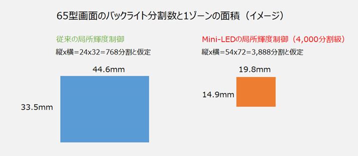 従来の局所輝度制御バックライトに対し、「Vidrian Mini-LED」ではひとつのゾーンが担当する面積が1/4弱まで小さくなるイメージだ。4Kから8K、つまり画素数が4倍になることを考えると、ミニLED化は必然なのかもしれない。