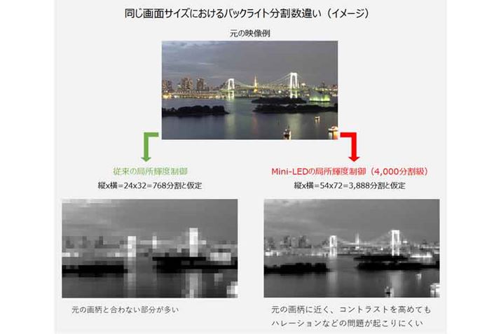 いっぽうのミニLEDは、マイクロLEDと似て非なるもの。現在のところ、ミニLEDには明確な定義や規格がないのだが、おおむね液晶テレビを構成する技術の一部で、従来のバックライトを分割してエリアごとに輝度を制御する「局所輝度制御」あるいは「ローカルディミング」と呼ばれる技術の延長線上にあるものだ。バックライトの分割をより細かくすることで、画柄に合わせてよりきめ細やかな明るさ調整が行え、コントラストアップを狙える。
