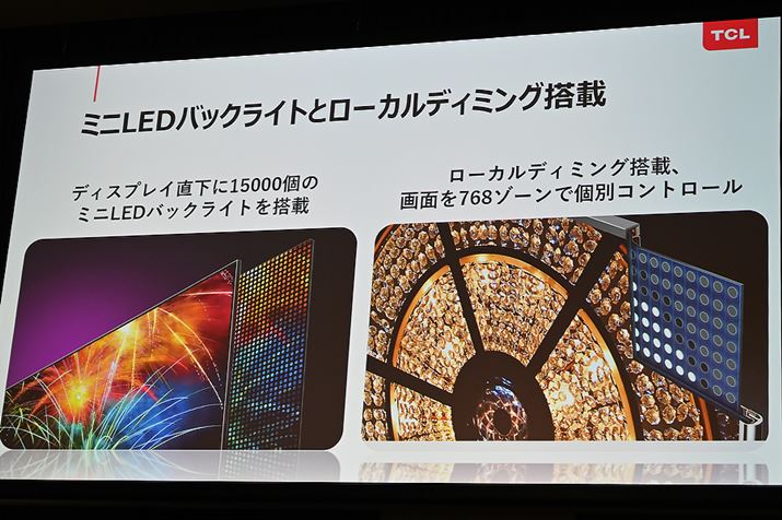 中国TCL社が「ミニLED採用」をうたうQLEDテレビ「X10」シリーズは、15,000個ものLED(極小サイズ)をバックライトに用いているのが特徴だが、コントロールするエリアの数は768。これは4Kテレビとして業界最高峰と言えるが、従来の局部輝度制御の範疇に収まるものだ。