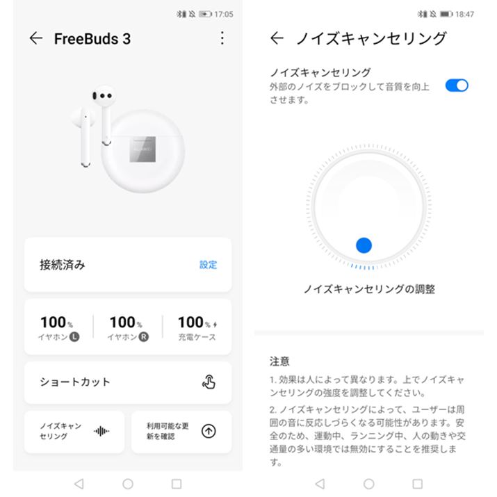 ノイズキャンセリング機能は、初期設定では左耳のイヤホン本体側面のタッチセンサーをダブルタップすることでON/OFFを切り替えることができ、接続するデバイスを問わず利用できる。さらに、Android OS向けに提供されている専用アプリ「HUAWEI AI Life」を使えば、ノイズキャンセリング効果を細かく調整することも可能だ。調整した設定はイヤホン側に保存され、一度調整が完了し、ノイズキャンセリング機能をONにすれば、保存した設定が呼び出される仕様なので、専用アプリが提供されていないiPhoneなどのiOSデバイスや、Windows OSを搭載したタブレットPC、携帯ゲーム機などでも、ノイズキャンセリング機能を十分に活用できる。