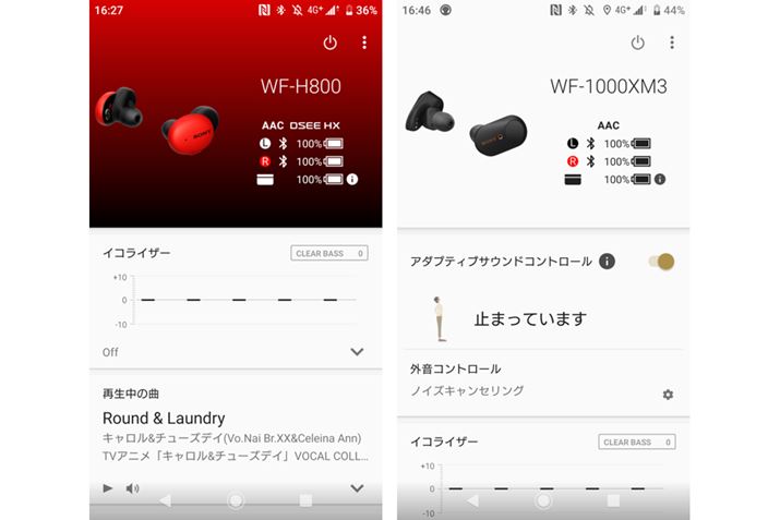 今回、ウォークマン「NW-ZX507」と音質優先で接続し、2製品を聴き比べてみたが、「WF-1000XM3」は勢いのある、パワフルなサウンドが印象的だった。低域も充分な量感があり、それでいてキレもあるのでノリのよいサウンドが楽しめた。いっぽう「WF-H800」の方はというと、中域の表現を重視した、バランスのよいサウンドが楽しめる。音色は刺激的過ぎず、曲によってはややライトな印象になるものの、そのぶん音色表現の多彩な、最新のトレンドに近いサウンドが楽しめる。ボーカルの立ち位置も近く、男性ボーカルも女性ボーカルもなかなか表情豊か。聴いていて、とても楽しいサウンドといえるだろう。