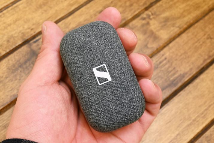 ファブリック素材を使用した専用ケース。イヤホン本体のバッテリーライフの改善もあり、ケースサイズはほぼ同じだが、バッテリー駆動は大幅に向上している