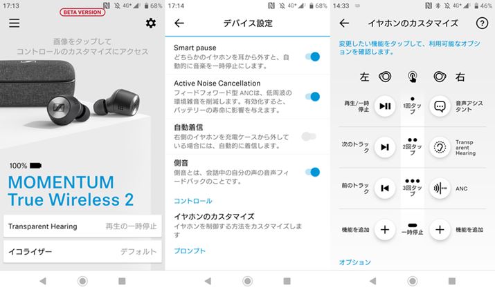 専用アプリ「Smart Control」にも対応(写真はベータ版)。イヤホンのボタン操作のフルカスタマイズや、製品のアップデートなども行えるという
