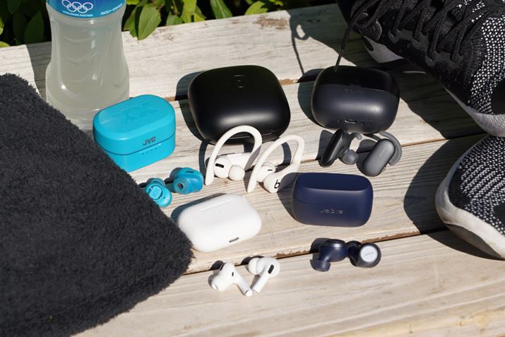 下の写真は、左から、アップル「AirPods Pro」、Beats by Dr. Dre「Powerbeats Pro」、ソニー「WF-SP900」、JVC「XX HA-XC50T」、Jabra「Elite Active 75t」
