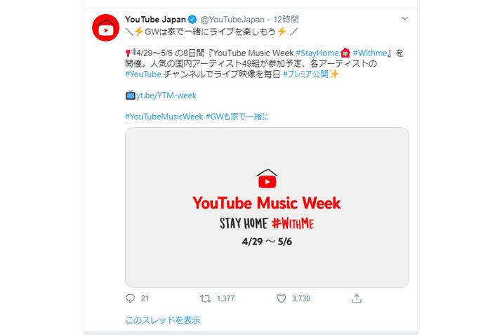 YouTube Japan公式ページアカウントが実施している「YouTube Music Week Stay Home #WithMe」は、国内のアーティスト、音楽レーベルが協力するライブ映像配信プログラム。2020年4月29日〜5月6日の期間で、さまざまなアーティストのライブ映像が公開されています!
