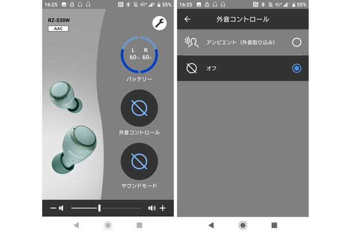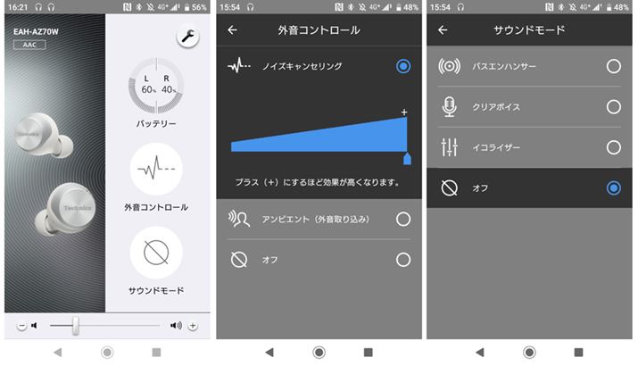 専用アプリ「Technics Audio Connect」では、ノイズキャンセリング機能の効果やサウンドモードの調整などが行える。ノイズキャンセリングと外音取り込みのレベルは100段階で調整可能だ