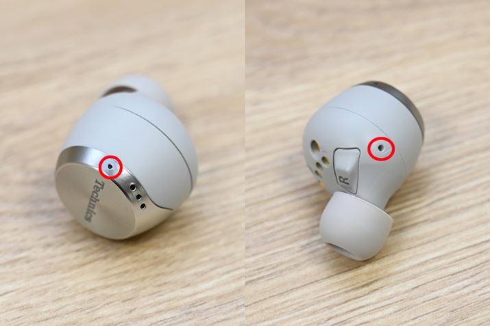 写真左の赤い丸で示した部分に通話用マイク、写真右の赤い丸で示した部分がノイズキャンセリング用フィードフォワードマイクが配置されている