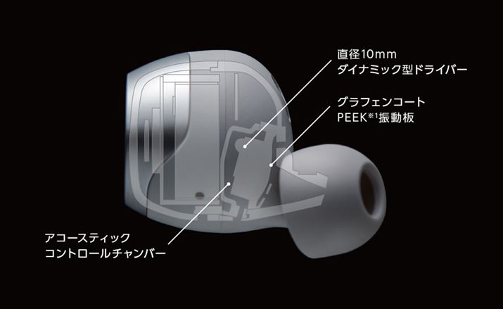 もちろん、「EAH-AZ70W」は音質にもこだわっている。今回デビューした3モデル中、最大となる10mm口径のグラフェンコートPEEK振動板採用のドライバーを搭載。また、イヤホン本体内部には、有線イヤホン「EAH-TZ700」にも採用実績のある、ドライバー前後の空気の流れを精密にコントロールする「アコースティックコントロールチャンバー」を配置して、さらなる高音質を突き詰めたという。
