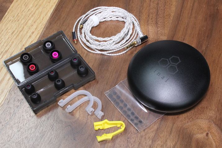 なお、イヤホン本体の素材はステンレスを採用。このため、重量は約41gと有線イヤホンの中ではかなり重い部類に入る。また、MAKEのようにユーザーが内部にアクセスできる構造は採用されていないが、長く使い続けてもらうためだろう、ノズル先端のフィルターは予備が付属している。このあたりは、finalならではの配慮といえる部分だ。また、イヤーピースは、同社オリジナルのものが5サイズ同梱されている。IEMタイプのイヤホンに付属するイヤーフックも、「A8000」からさらに改良されたものとなった。