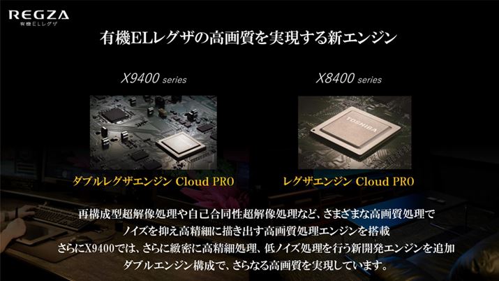 映像エンジンの名称は、フラッグシップモデルのX9400シリーズが「ダブルレグザエンジン Cloud PRO」、X8400シリーズが「レグザエンジン Cloud PRO」。後者は4K液晶レグザの最上位モデルとなるZ740Xシリーズで搭載されたものを有機ELパネル向けにチューンしたもの、前者は「レグザエンジン Cloud PRO」に専用の映像エンジンをさらに追加したチップ構成となる。