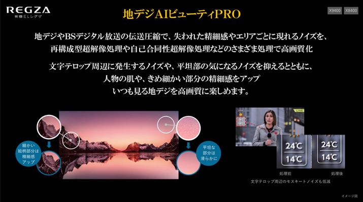 いずれも、クラウド上に構築された詳細ジャンルやコンテンツごとの画質調整パラメーターと連携して放送コンテンツを高画質化する「クラウドAI高画質テクノロジー」をはじめ、ネット動画を配信サービスごとの画質特性や圧縮方式、解像度に合わせて高画質化する「ネット動画ビューティ PRO」、AI技術を駆使して地デジやBSなどの2Kコンテンツを高精細な4K映像にアップコンバートする「地デジAIビューティPRO」、搭載する色温度センサーを連動して視聴環境の明るさや照明の色の違いに合わせて最適な画質に自動調整する「おまかせAIピクチャー」といった高画質化機能に対応。さらに、「ダブルレグザエンジン Cloud PRO」を搭載するX9400シリーズは、2Kコンテンツだけに動作するという追加の映像エンジンによって、フレーム超解像処理や3次元ノイズリダクション処理が追加で行われるようになっており、地デジやBSなどの2Kコンテンツがさらに高画質に楽しめるという。