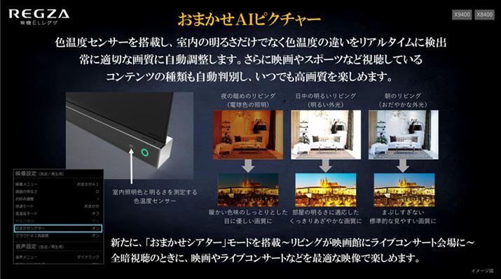 搭載する色温度センサーを連動して視聴環境の明るさや照明の色の違いに合わせて最適な画質に自動調整する「おまかせAIピクチャー」ももちろん搭載