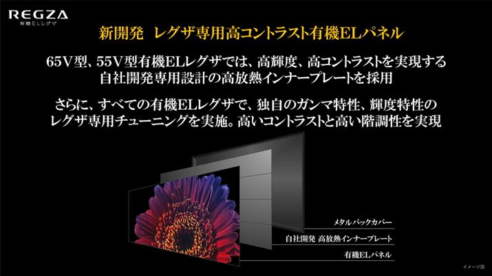 4K有機ELレグザの2020年モデルは、有機ELパネルについても進化を遂げている。2019年モデルでも、レグザ用にチューニングを施した専用設計の有機ELパネル採用をアピールしていたが、新モデルもパネルを2020年最新仕様へとアップグレードし、独自のガンマ特性・輝度特性を施した有機ELパネルを採用している。また、65V型と55V型については、有機ELパネルとバックパネルの間に配置されているインナープレートを自社開発した専用設計の高放熱インナープレートに変更しているのもポイントだ。