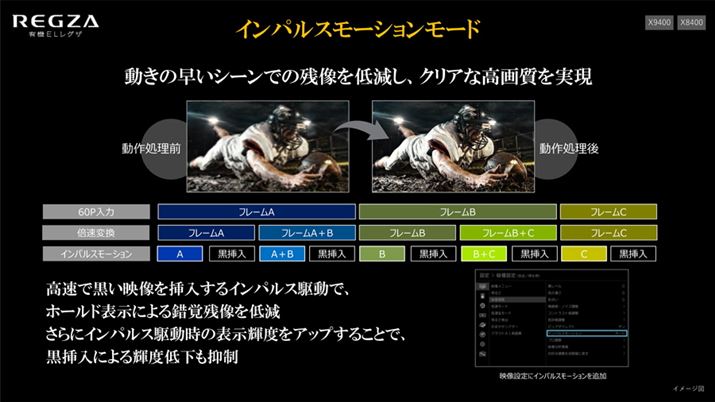 新たに導入された「インパルスモーションモード」。インパルス駆動時の表示輝度を引き上げることで、平均輝度の低下を最小限に抑えているという