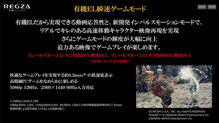 有機ELパネルだからできる動画応答性能と「インパルスモーションモード」を掛け合わせたキレッキレの動き、常時明るい画面がゲームに最適ということで、2020年モデルからは「有機EL瞬速ゲームモード」として訴求していくという。1080p/120Hz入力にも対応しており、ゲームユーザーは要注目のモデルと言えそうだ。