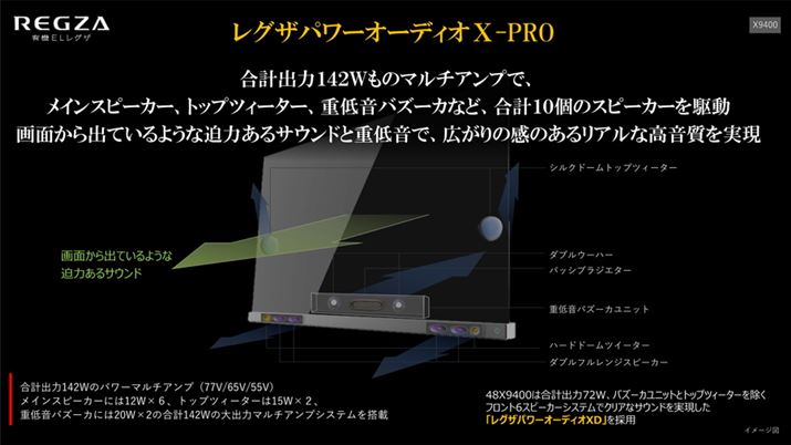 X9400シリーズに搭載されている「レグザパワーオーディオX-PRO」。48V型を除く3モデルは、合計出力142Wのパワーアンプで合計10基のスピーカーを駆動する