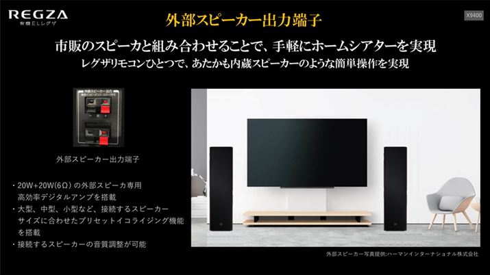 さらにX9400シリーズは、外部スピーカー出力端子を新たに搭載したのも見逃せない。デジタルアンプ駆動で、出力は20W+20W(6Ω)。接続するスピーカーサイズに合わせたプロセットイコライジング機能や音質調整機能なども備えている。レグザの内蔵スピーカーシステムとは排他利用となるが、市販のスピーカーを用意するだけで本格的なスピーカーシステムを構築でき、リモコンひとつで内蔵スピーカーと外部スピーカーを切り換えられるというのはなかなか便利そうだ。