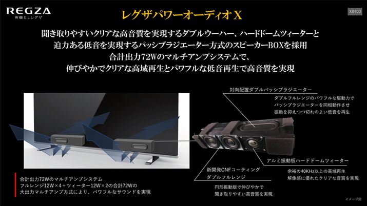 X8400シリーズのスピーカーシステムには、X9400シリーズに搭載された新型の2ウェイスピーカーを下方向に向けて搭載し、合計出力72Wのマルチアンプシステムで駆動する「レグザパワーオーディオ]」を採用。ダブルフルレンジスピーカーとハードドームツイーターによる伸びやかでクリアな高域再生と、対向型パッシブラジエーターによるパワフルな低音再生を楽しめるという。