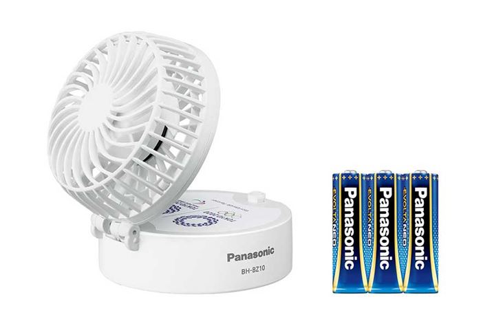 さらに、風量は3段階切り替えに対応。乾電池「エボルタNEO」を使用の場合、最長約12時間使用することが可能(風量「弱」の場合)。単3形乾電池「エボルタNEO」3本が付属しており、電源のない場所でも購入してすぐに使うことができる。