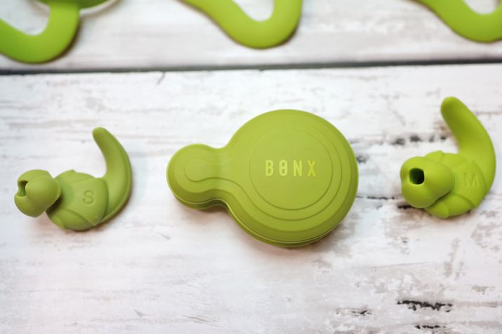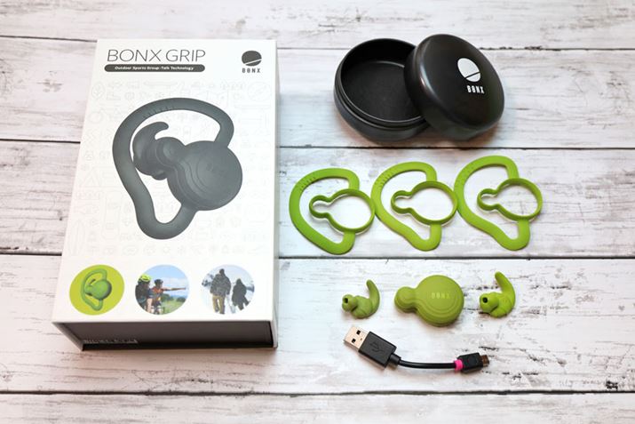 それでは、BONX GRIP(以下、GRIP)から。上述の通り、本機は雪山などスポーツシーンでの利用を想定して開発されており、シリコン製のイヤーループとイヤーキャップでしっかりと耳に引っかけて使うタイプのヘッドセットです。IPX5の生活防水規格に準拠しているので、雨や雪が降る中や飛沫のかかるウォータースポーツ中の利用が可能です。