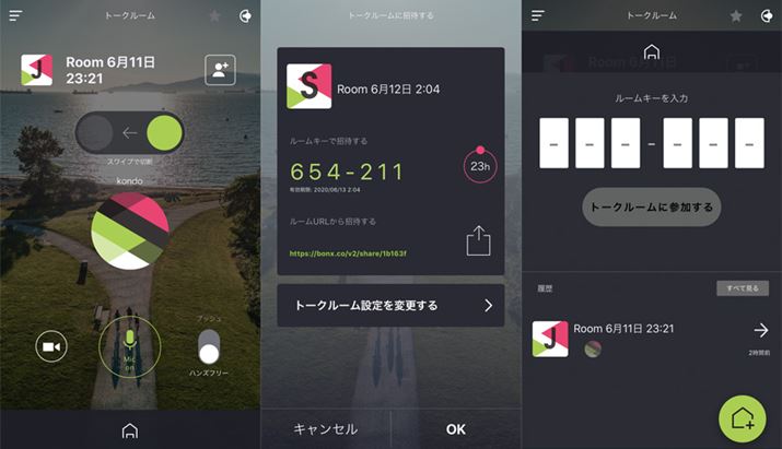 一番左がBONXアプリのメイン画面。最下部のホームボタンを押すと、現在のトークルームのキーナンバーが表示されます。真ん中はルームキーを表示したところ。24時間有効です。この番号をメールやメッセンジャー、SMS等でほかの人に送ってアクセスします。右は、ルームキーを受け取った側は入力画面でキーを入力する画面。ここからクローズドなトークルームに参加できます