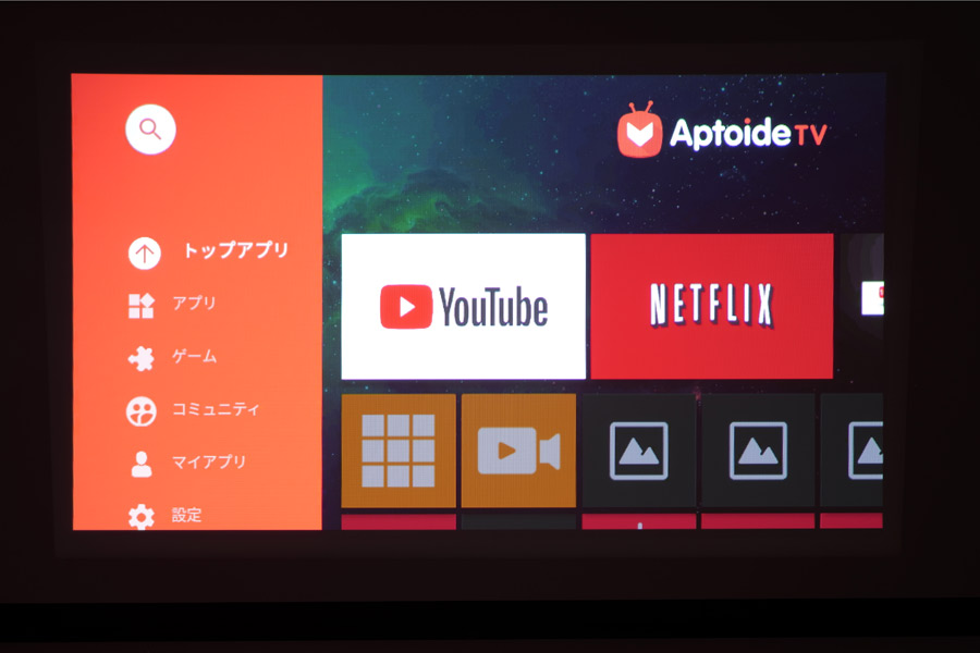 GV1を投影したところ。YouTubeやNetflixアプリをインストールできる