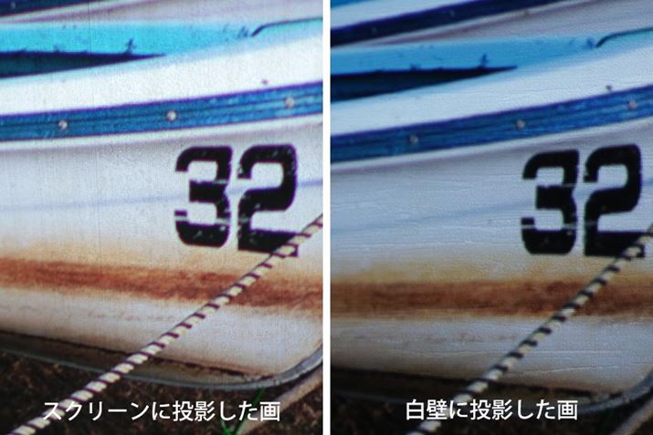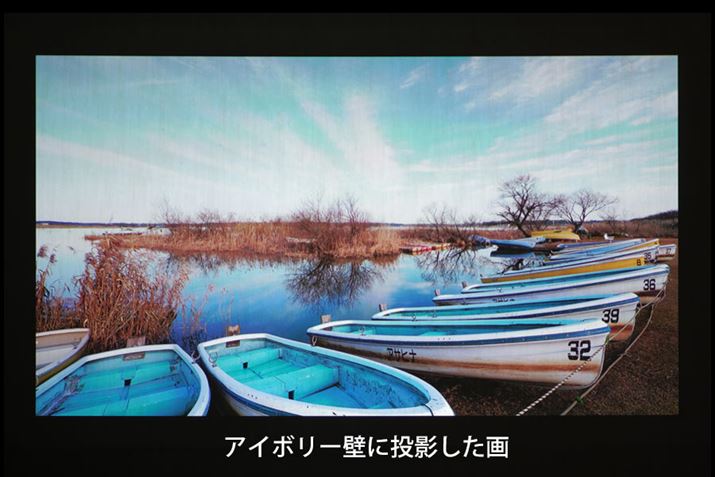 では、スクリーンを使わないデメリットは何かといえば、最も大きいのは、投影される映像の画質である。映像の明るさやコントラスト、色乗りなどは、どうしてもスクリーン使用時に比べて低下する。