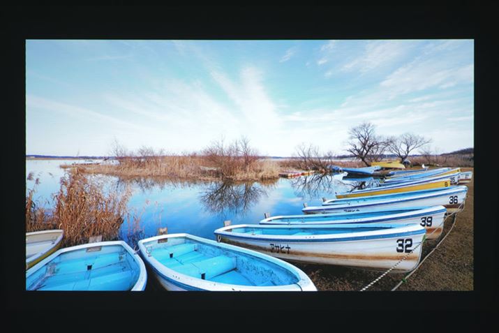 おそらくみなさんが気になるのは、壁投影とスクリーン投影でどれくらい画質に変化があるかだろう。そこで、筆者宅のAV視聴室に設置しているスクリーンに80インチで投影した場合と比較してみたのが、以下の画像だ。写真だと少々わかりづらいかもしれないが、パッと見た感じ、壁投影とスクリーン投影で最も顕著な違いが出るのはコントラストだった。