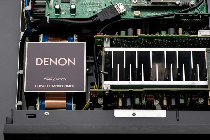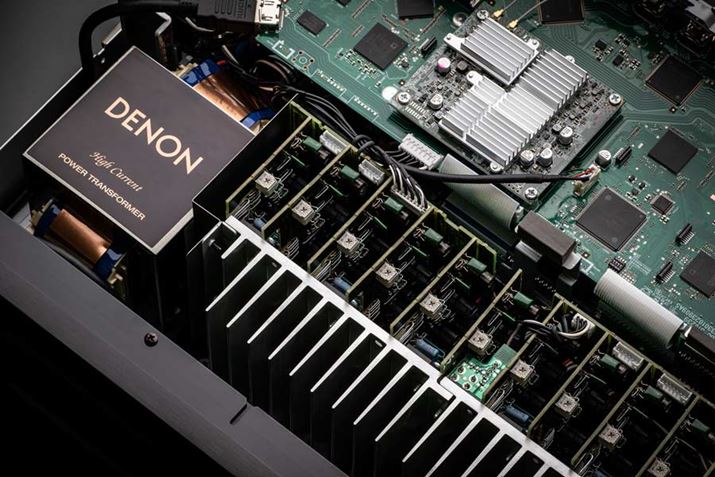 上位モデルのAVC-X6700Hは、全チャンネル同一クオリティのディスクリート・パワーアンプをそれぞれ個別基板に独立させた、11chの「モノリス・コンストラクション・パワーアンプ」構造を採用。電源供給もそれぞれ独立させることにより、チャンネル間の干渉やクロストークを抑えている。ヒートシンクには共振の少ないアルミ押し出し材を採用。またパワートランジスタには、フラッグシップモデルのAVC-X8500Hと同じ大電流タイプの「DHTC」を使用し、安定したバイアス特性を確保した。