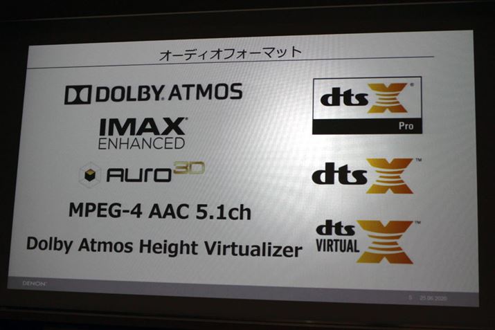 「Dolby Atmos Height Virtualizer」「DTS Virtual:X」などにも対応。チャンネルベースのイマーシブオーディオ規格「Auro-3D」もサポートする