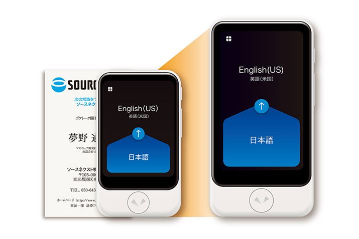 名刺サイズのカメラ翻訳搭載「ポケトーク S」の姉妹モデル。機能および翻訳性能はそのまま、本体サイズを大きくした点が特徴。3.97型ディスプレイを採用し、「文字の見やすさ、相手への見せやすさを実現した」とのこと。