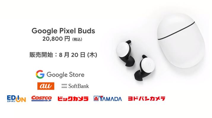 「Google Pixel Buds」はGoogleストア、au、ソフトバンクのほか、家電量販店にて2020年8月20日より発売されます。