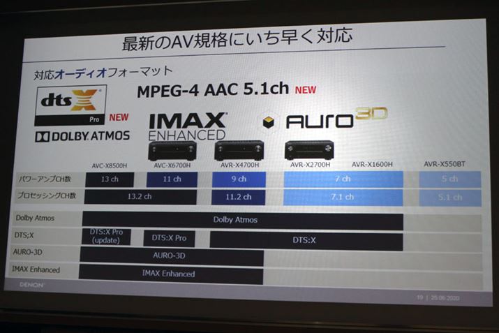 モデルごとの対応フォーマットの違いはこの通り。IMAX EnhancedやAURO-3Dなどは上位機種のみ対応だが、AVR-X2700Hは基本仕様をしっかり押さえつつ、新たにMPEG-4 AACに対応したのがエントリーモデルとの差別化ポイント