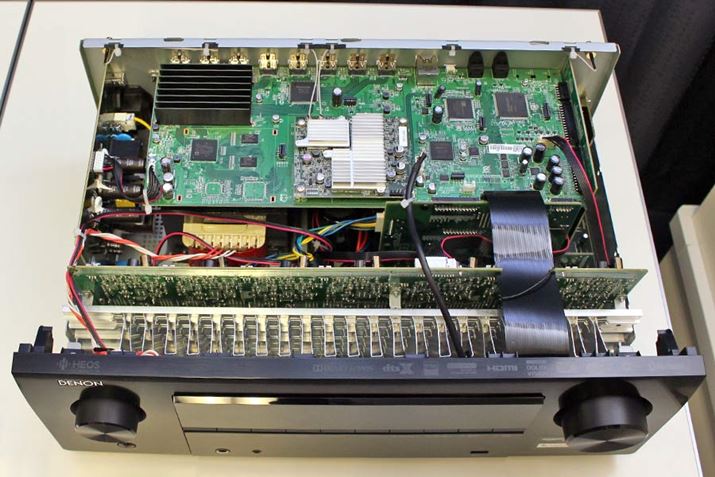 電源部にはカスタム仕様の大型EIコアトランスを採用する。このほか、電源部のブロックコンデンサーには、AVR-X2700H専用にチューニングされた大容量12,000uFのカスタムコンデンサーを2基搭載