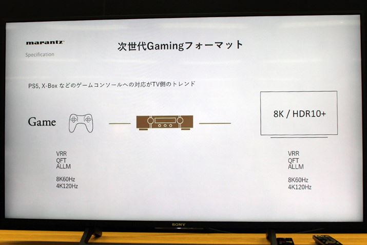 先行発表されたデノンのAVアンプもそうだが、VRR、QMS、ALLMなど、次世代ゲーミングデバイスで採用されるフォーマットに積極対応しているのは注目ポイント