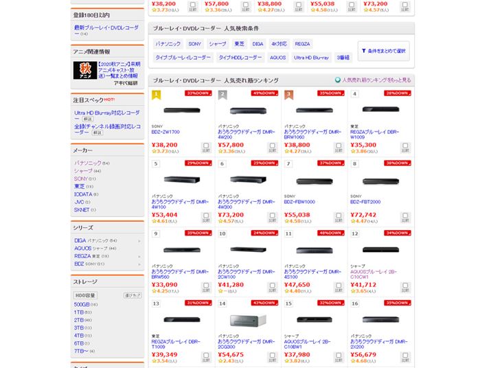 2020年8月下旬自体の価格.comレコーダー「ブルーレイ・DVDレコーダー」カテゴリーのランキング。さまざまなタイプが混在している